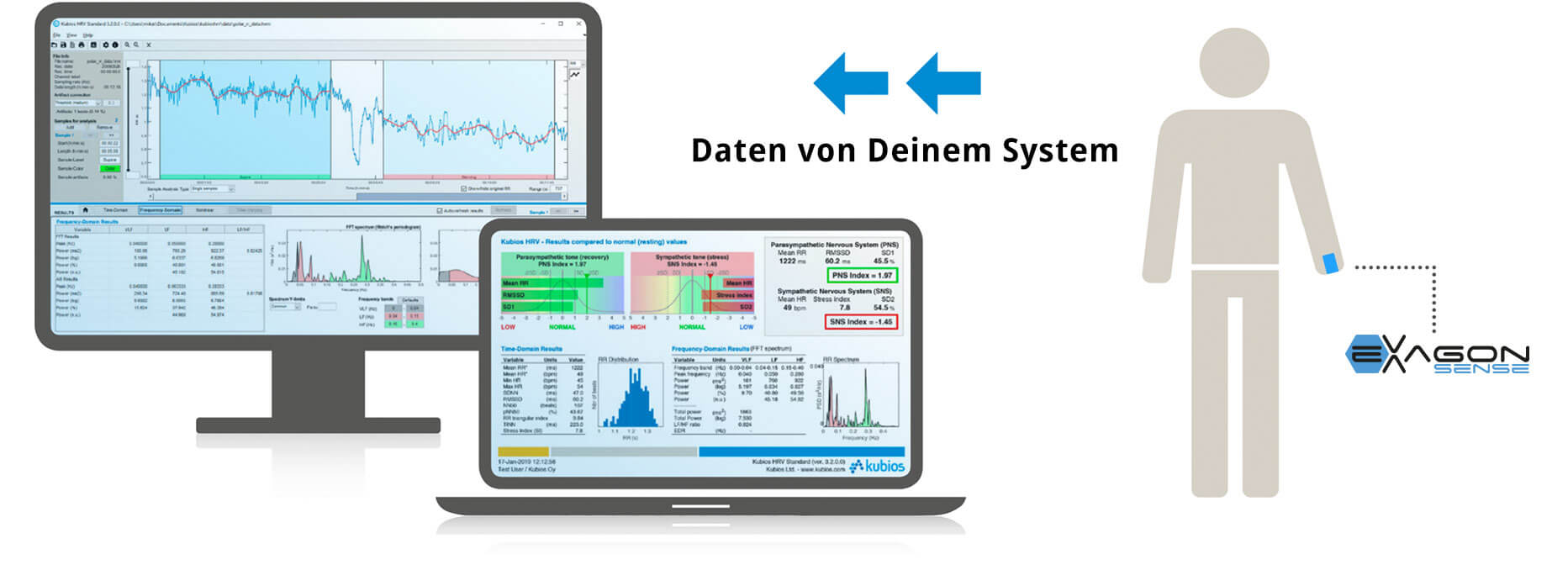 Exagon Sense, in Kombination mit KUBIOS, kann zur Beobachtung und Auswertung des vegetativen Nervensystems genutzt werden. Über einen längeren Zeitraum von iMRS prime-Anwendungen dienen die Messdaten auch für die Evaluierung etwaiger Veränderungen und Verbesserungen.